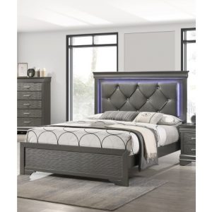 Dark Gray Faux Leather Tufted Headboard 1pc Queen Size Bed W LED Bedroom